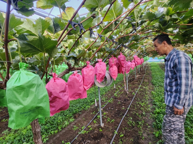 ![]() 경주시가 개발한 기능성 핑크봉지를 활용해 샤인머스켓 포도에 착색을 유도하고 있는 모습. |