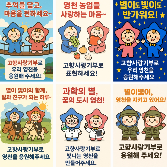 홍보 배너는 △보현산댐 출렁다리 △보현산천문과학관 △최무선과학관 △영천전투메모리얼파크 △운주산승마조련센터 등 영천의 대표 관광명소에 설치됐으며, 영천시 대표 캐릭터 ‘별이’와 ‘빛이’를 활용해 친근하고 따뜻한 분위기로 고향사랑기부제를 안내하고 있다.