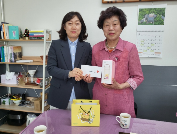 동여수노인복지관 이희승 관장은 “카카오와 함께하는 슬기로운 디지털 생활’ 사례공모전에 우리 복지관의 이숙희 어르신께서 선정되셨다는 기쁜 소식을 전하게 되어 매우 뜻깊고 자랑스럽게 생각합니다.” 라는 축하의 메시지와 시상품을 전달했다.
