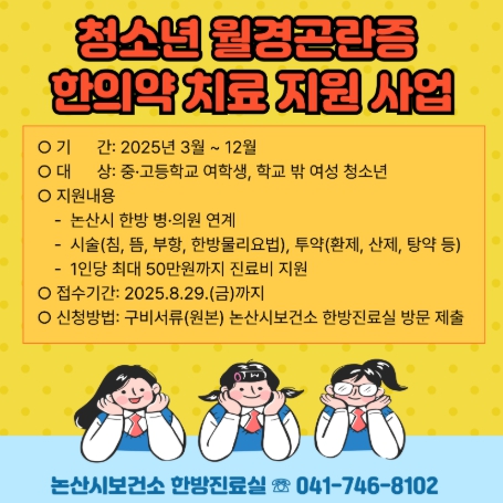 논산시 관내 한방 병·의원에서 치료 시작일부터 3개월간 월 2회 이상 월경곤란증 완화를 위한 시술(침, 뜸, 부항, 한방 물리요법), 투약(환제, 산제, 탕약 등)의 치료를 받을 수 있으며 1인당 50만원까지 진료비가 지원된다.