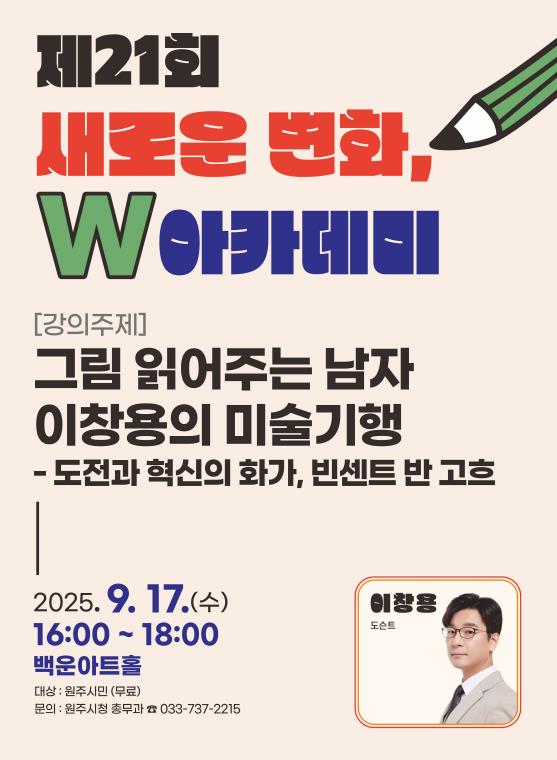 이번 강연은 우리나라 대표적인 전문 도슨트이자 문화 해설가로 활발히 활동 중인 이창용 도슨트를 초청해, ‘그림 읽어주는 남자 이창용의 미술기행-도전과 혁신의 화가 빈센트 반고흐’를 주제로 시민들에게 흥미롭고 깊이 있는 미술 이야기를 들려준다.