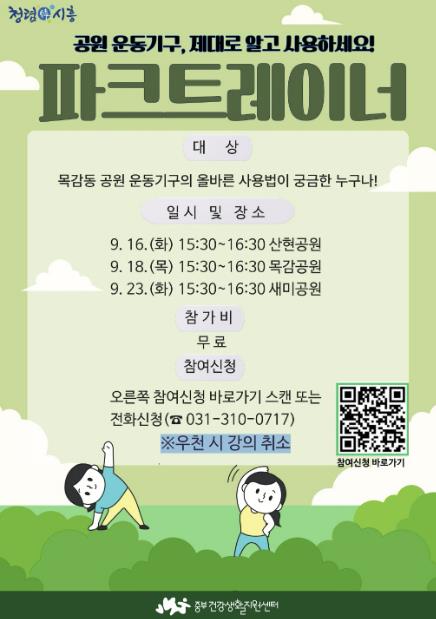 또한, 9월 26일 능곡동 신안인스빌, 10월 17일 장현동 LH18단지 운동기구 존에서 오후 4시부터 한 시간씩 건강아파트 주민을 대상으로 ‘찾아가는 파크트레이너’ 프로그램을 운영할 예정이다.