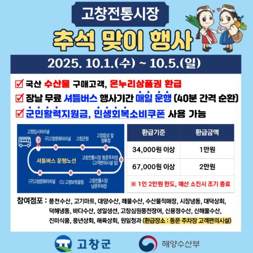 먼저, 기존 장날(매월 3·8일)에만 운영하던 고창전통시장 셔틀버스를 10월 1일부터 5일까지 추석 연휴 기간 동안 확대 운행한다.