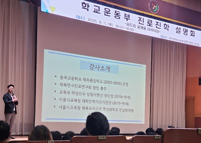 이번 아카데미는 학부모 요구를 반영하여 개최했으며, 부산시교육청을 비롯한 5개 교육지원청이 협력하여 진로・진학 정보를 제공했다. 강사로는 유신 사무처장(학교체육진흥위원회)과 김재우 장학사(시교육청 인성체육급식과)가 나서 체육특기자 선발 절차와 대학 진학 전략, 체육계열 진로 탐색 및 다양한 직업 분야 안내 등 학생선수와 학부모가 궁금해하는 실질적인 정보를 제공했다.