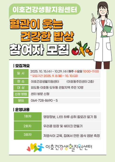 참여를 희망하는 주민은 10월 10일까지 이호건강생활지원센터를 방문해 신청하면 되고, 모집 인원은 선착순 10명이다.