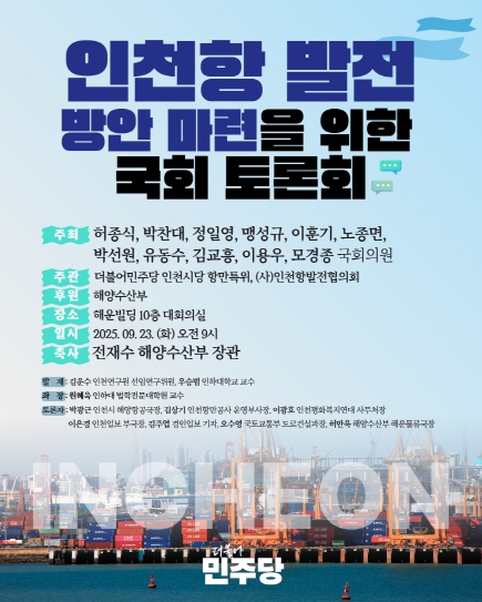 더불어민주당 허종식(인천 동구미추홀구갑) 국회의원은 9월 23일 오전 9시 여의도 해운빌딩 10층 대회의실에서 ‘인천항 발전 방안 마련을 위한 국회 토론회’를 개최한다고 밝혔다.