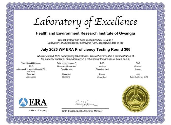 광주보건환경연구원은 이번 성과로 10년 연속 국제 숙련도시험에서 우수한 평가를 이어가며, 일관된 품질관리 체계와 세계적 수준의 분석능력을 재확인했다.