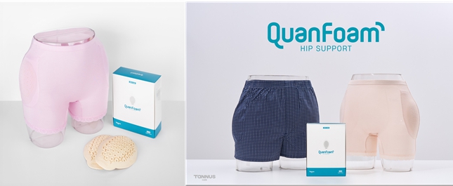 ‘퀀폼 힙서포트’는 충격 속도에 따라 점도가 변하는 신소재를 적용한 두께 10mm, 무게 20g의 가볍고 유연한 패드로, 일상에서 부담 없이 착용 가능하며 노인 낙상으로 인한 고관절 골절 예방과 관리에 효과적이다.