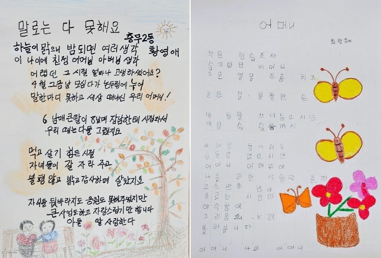 황영애 어르신의 수상작 ‘말로는 다 못해요’는 늦은 밤 친정 어머니와 아버지를 떠올리며 느낀 애틋한 감정과 건강하게 자란 자식들을 자랑스러워하는 마음을 담았다.