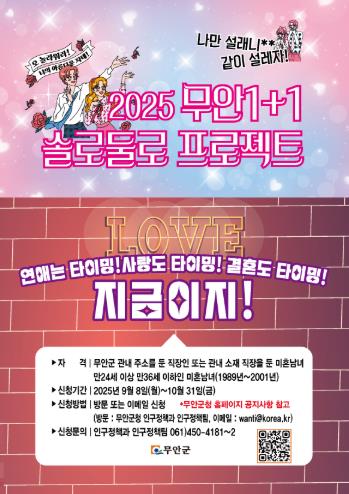 이번 솔로둘로 프로젝트 참가 대상은 무안군 거주 직장인 또는 군내 직장을 둔 미혼남녀(1989~2001년생, 만 24~36세)이며, 신청은 2025년 9월 8일부터 10월 31일까지, 방문 또는 이메일로 신청할 수 있다.