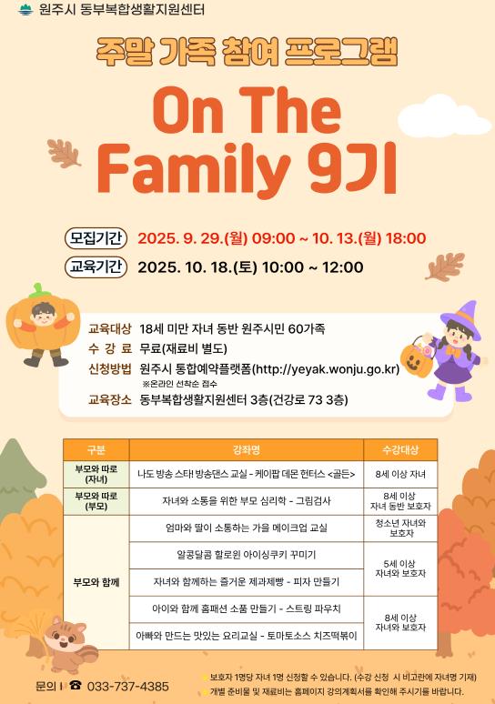 9기 프로그램에서는 ▲자녀와 함께하는 즐거운 제과제빵 ▲아빠와 만드는 맛있는 요리교실 ▲아이와 함께 홈패션 소품 만들기 ▲알콩달콤 할로윈 아이싱쿠키 꾸미기 ▲엄마와 딸이 소통하는 가을 메이크업 교실 ▲나도 방송 스타! 방송댄스 교실(자녀) ▲자녀와 소통을 위한 부모 심리학(부모) 등 총 7개 강좌가 진행된다.