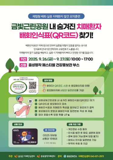 이번 행사는 체험형 배회·실종 치매환자 발견 모의훈련으로, 공원 내 곳곳에 숨겨진 배회인식표(QR코드)를 찾고 응모하는 방식으로 실시된다.