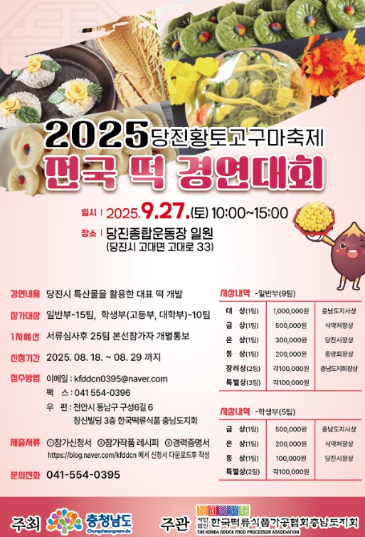 이번 대회에는 총 25개 팀(일반부 15팀, 고등·대학생부 10팀)이 참가해 당진의 대표 농산물인 고구마, 감자, 쌀 등 활용한 창의적인 전통 떡을 선보인다.