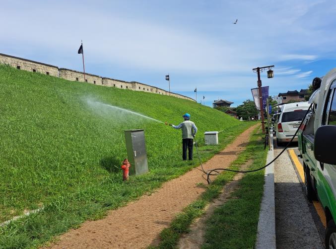 ![]() 팔달구 보건소 관계자가 23일 수원화성 일대에서 방역특장차를 활용해 방역을 하고 있다. |