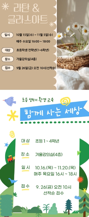 이번 프로그램은 생태 수업과 공예 수업 두 가지 강좌로 운영되며, 생태 수업은 10월 16일부터 11월 20일까지 매주 목요일에 초등학교 1~4학년을 대상으로 운영되며 ‘함께 사는 세상’을 주제로 가을과 겨울의 생태를 탐구한다.