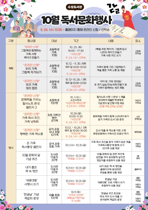 또, 10월 문화의 달을 기념하여 ▲문해력 필사노트 완성 챌린지, ▲문화의 달 기념 퀴즈, ▲내가 뽑은 책 속 한 구절, ▲세종대왕 사행시 쓰기 등 다양한 추첨 경품 행사도 함께 진행된다.