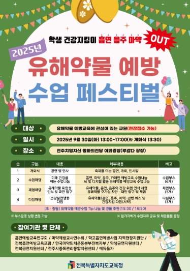 전북교육청은 오는 30일 전주 치명자산 평화의전당 야외광장에서 ‘2025. 유해약물 예방 수업 페스티벌’을 개최한다고 24일 밝혔다.