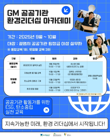 광명시환경교육센터는 오는 25일부터 10월 30일까지 ‘2025 GM(지엠) 공공기관 환경리더십 아카데미’를 운영한다.