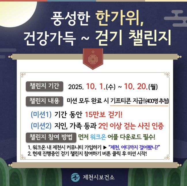 ![]() 제천시보건소, 추석맞이‘걷기 챌린지’운영 |