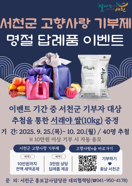 ![]() 서천군, 추석맞이 고향사랑기부제 감사 이벤트 |