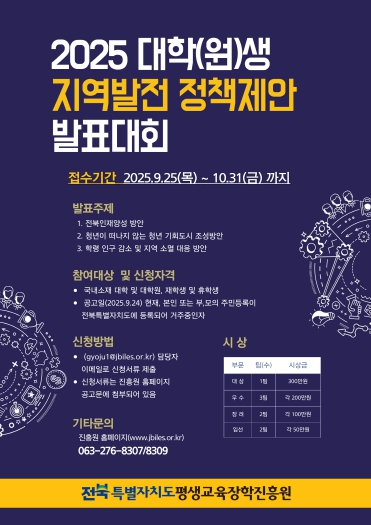 이번 대회의 공모 주제는 △전북인재양성 △청년기회도시 조성 △학령인구 감소 및 지역소멸 대응 방안 등으로, 참가자는 이 중 한 가지를 선택해 정책 아이디어를 제안하면 된다.