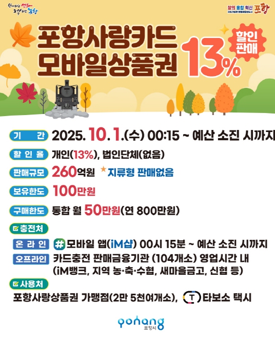 ![]() 포항사랑상품권 13% 할인 판매 |