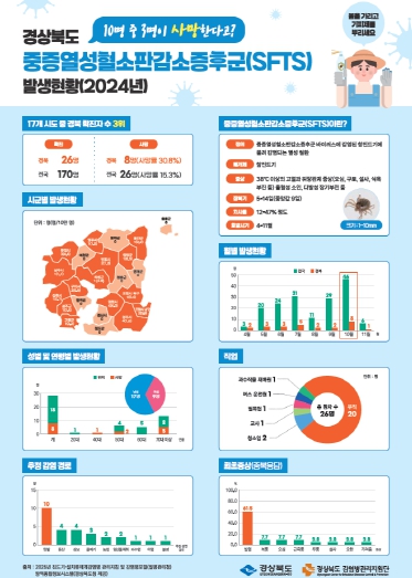 경상북도는 2024년 기준 17개 시도 중 SFTS 확진자 수가 26명으로 세 번째로 많았으며, 사망은 8명으로 사망률 30.8%에 육박했다. 이처럼 치명률이 매우 높고, 예방접종이 없기에 긴 옷과 긴 바지, 긴 양말과 장화 등을 갖춰 처음부터 물리지 않는 것이 매우 중요하다.