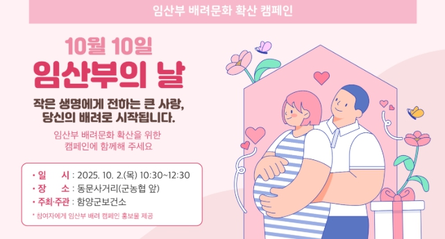 ![]() 함양군은 오는 10월 2일 함양읍 일원에서 ‘2025 임산부의 날 기념 캠페인’을 개최한다. 이번 캠페인은 임산부에 대한 존중과 배려 문화를 확산하고, 군민의 인식 개선과 공감대 형성을 위해 마련됐다. |