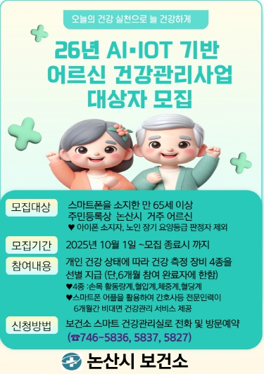 보건소 관계자는 “AI-IoT 기반 어르신 건강관리사업은 참여자의 90% 이상이 서비스에 만족한다고 응답할 만큼 효과가 입증된 사업”이라며 “2026년에는 더 많은 어르신이 참여해 건강하고 행복한 일상을 누리시길 바란다”고 말했다.