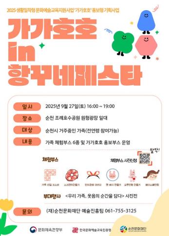 ![]() (재)순천문화재단, 가족과 함께 즐기는 문화예술놀이터 ‘가가호호 in 항꾸네페스타’ 운영 |