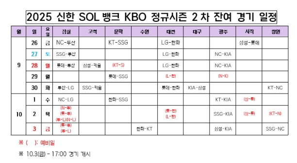 편성된 경기는 1차 잔여 경기 일정에서 우천 취소된 후 편성되지 않았던 7경기이며, 10월 3일(금)까지 편성됐다.