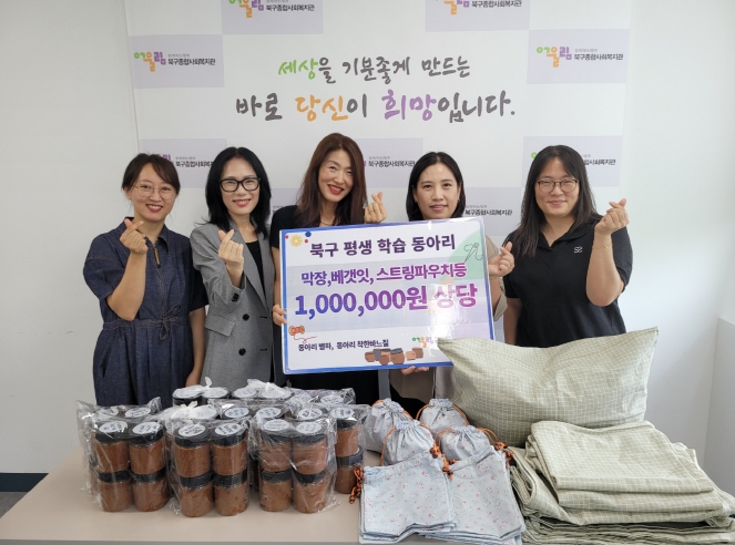 ![]() 북구 평생학습관 학습동아리 '별하'(전통발표)와 '착한 바느질'(미싱 및 바느질)은 26일 북구종합사회복지관에 100만원 상당의 전통 막장과 미싱 및 바느질 제품을 기부했다. |