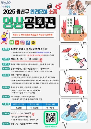 광산구 관계자는 “시민이 직접 제작한 숏폼 영상을 통해 안전문화 확산에 이바지하고 광산구만의 특색 있는 안전정책과 현장을 알리는 계기가 될 것”이라며 “많은 시민의 관심과 참여를 바란다”고 전했다.