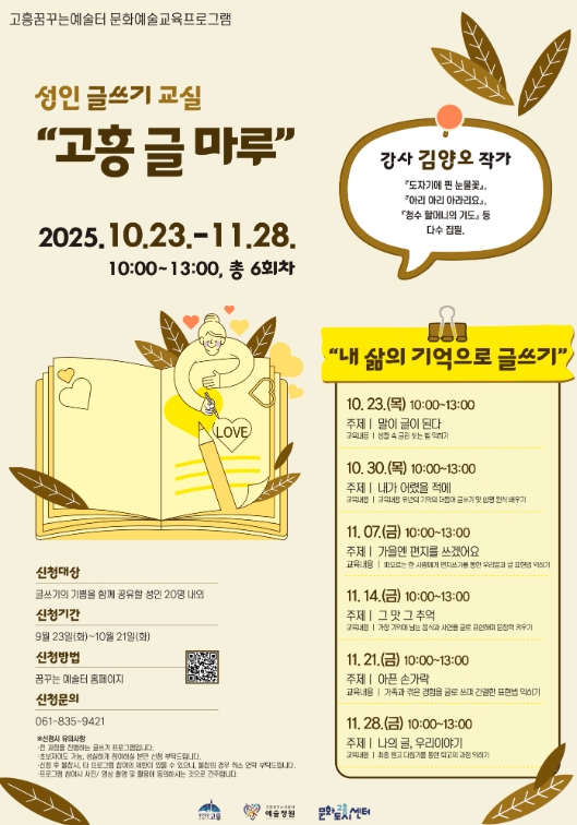 ![]() 성인 글쓰기 교실 ‘고흥 글마루’ 운영 |
