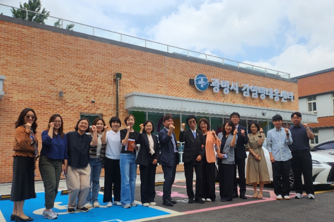![]() 29일 성남시 분당구보건소 관계자들이 광명시 감염병대응센터를 벤치마킹하기 위해 방문해 기념사진을 촬영하고 있다. |