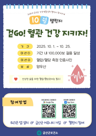 ![]() 금산군보건소, 10월 건강생활실천 ‘걷고(GO)! 혈관 건강 지키자!’ 진행 |