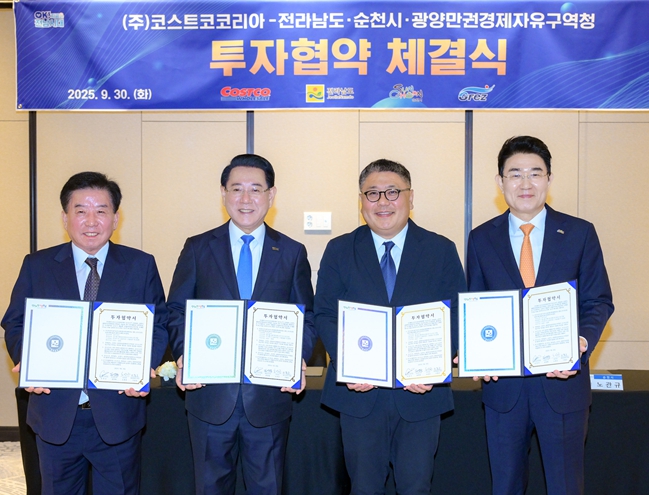 순천시는 30일 서울 여의도 페어몬트 앰배서더 호텔에서 ㈜코스트코코리아(이하 “코스트코”), 전라남도, 광양만권경제자유구역청과 순천 입점을 위한 투자협약(MOU)을 체결했다.