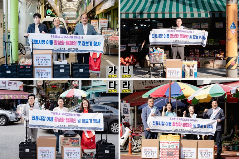 의원들은 각 상권별로 나뉘어 상인들의 노고에 공감하고, 함께 소통하는 시간을 가졌다. 가 선거구 의원들은 중곡제일시장, 나 선거구 의원들은 군자동 일대 시장, 다 선거구 의원들은 자양전통시장, 라 선거구 의원들은 자양한강전통시장 및 노룬산·영동교 골목시장을 직접 방문해 온누리상품권으로 식재료, 농수산물, 생활용품 등을 구입했다.