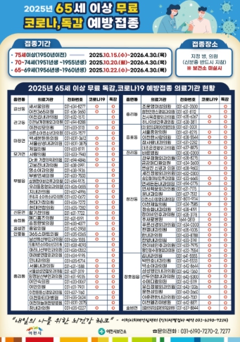 인플루엔자와 코로나19 무료 예방접종 대상자는 주소지 관계없이 전국 지정 의료기관에서 접종할 수 있고 관련 정보는 보건소 누리집 및 예방접종도우미누리집에서 확인할 수 있다.