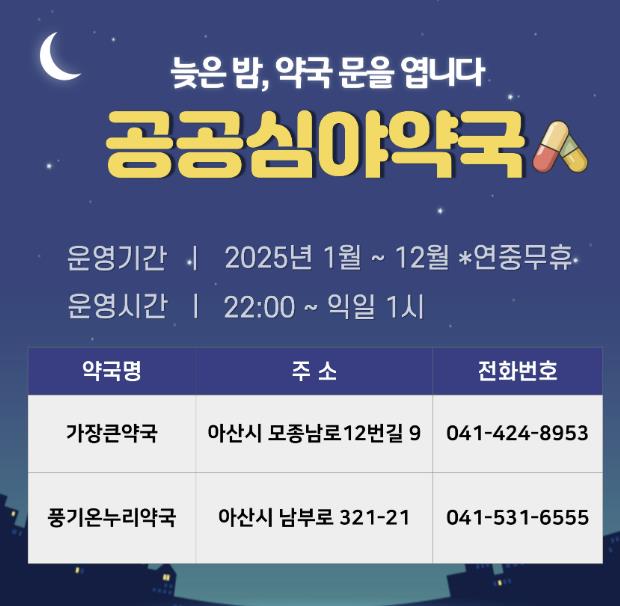 올해 지정된 공공심야약국은 △가장큰약국(아산시 모종남로12번길 9) △풍기온누리약국(아산시 남부로 321-21) 총 2개소로, 밤 10시부터 익일 오전 1시까지 운영된다. 또한, 주말과 공휴일, 명절에도 운영되어 언제든지 의약품 구매가 가능하다.