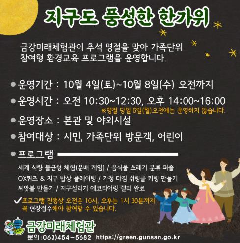 금강미래체험관은 오는 4일부터 8일까지 닷새간 본관과 야외시설 일대에서 ‘지구도 풍성한 한가위’를 주제로 한 특별 프로그램을 운영한다.