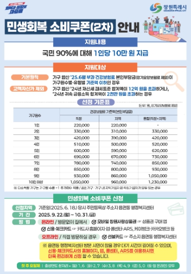 한편, 2차 소비쿠폰은 10월 31일까지 신청할 수 있으며, 11월 30일까지 사용하지 않으면 소멸된다. 신청은 주소지 읍·면·동 행정복지센터 방문, 카드사 홈페이지·앱, 또는 모바일 지역사랑상품권 앱을 통해 가능하다.