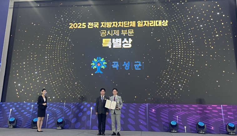 ![]() 2025년 전국 지방자치단체 일자리대상에서 특별상을 받는 모습 (좌 김영훈 고용노동부 장관, 우 곡성군 정창모 부군수) |