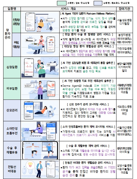 ‘의료AI 혁신 생태계 조성(닥터앤서3.0)’ 사업은 환자가 일상으로 복귀한 이후에도 주도적으로 예후를 관리할 수 있도록 AI가 돕고, 응급상황 시 의료진이 적시에 개입할 수 있도록 지원하는 서비스 개발‧실증 사업이다. 당초 ’25년도 예산 규모(23억원)에 따라 유방‧신장암, 심장질환 등 4종의 재활‧만성 질환을 선정했으며, 하반기 추경(40억원 증)을 계기로 위암‧대장암, 산모 질환 등 6종의 질환을 추가 선정하여 총 10종 질환에 특화된 AI 예후 관리 서비스를 개발한다.