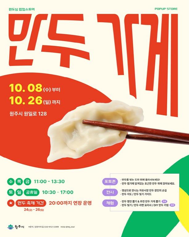 팝업스토어에서는 전통시장과 원주의 음식문화를 담은 영상이 상영되고, 만두 지도·빚기 가이드가 제공된다. 또한 만두 빚기 체험, 만두 라면 끓여 먹기, 만두가게 추천 및 명언 뽑기, 열쇠고리 제작 등 온 가족이 즐길 수 있는 체험도 마련되며, 포토존에서는 만두를 형상화한 무대에서 특별한 인증사진을 촬영할 수 있다.