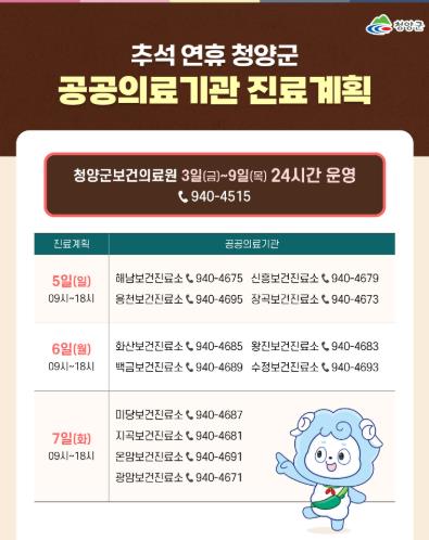 보건의료원 관계자는 “연휴 기간 군민과 귀성객 모두가 안전하고 건강한 명절을 보내실 수 있도록 빈틈없는 진료체계를 유지하겠다”고 말했다.