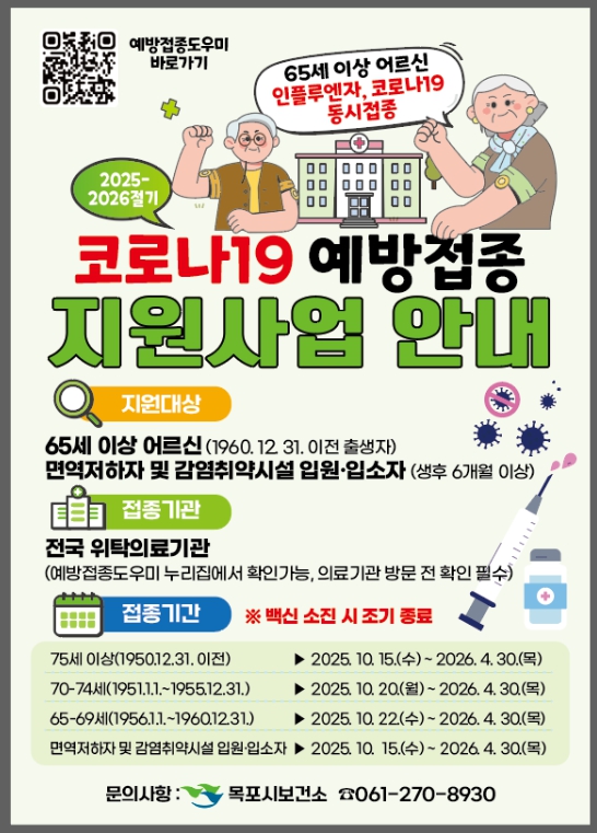 접종 대상은 ▲65세 이상 어르신 ▲생후 6개월 이상 면역저하자 ▲감염취약시설 입원·입소자이며, 목포시 위탁 의료기관 71개소에서 모더나와 화이자 등 LP.8.1 백신을 무료로 접종받을 수 있다.