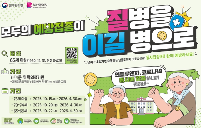 안전한 접종을 위해 연령대별 순차적으로 시행되며 ▲75세 이상은 10월 15일 ▲70세 이상은 10월 20일 ▲65세 이상은 10월 22일부터 주소지와 관계없이 지정 위탁의료기관에서 무료 접종을 받을 수 있다.