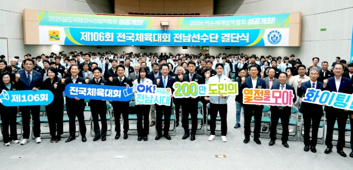 ![]() 전라남도 제106회 전국체전 참가 선수단 결단식이 2일 오후 도청 왕인실에서 열린 가운데 김영록 전라남도지사가 주요 내빈 및 선수단과 성공체전을 위해 파이팅하고 있다. |