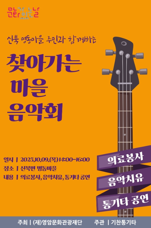 이번 음악회는 영암 신북면 명동리에 위치한 경로당 앞마당에서 열리며, 백룡산 숲길이 조성된 명동마을은 가을의 정취를 느끼며 산책하기 좋은 명소로 알려져 있다.